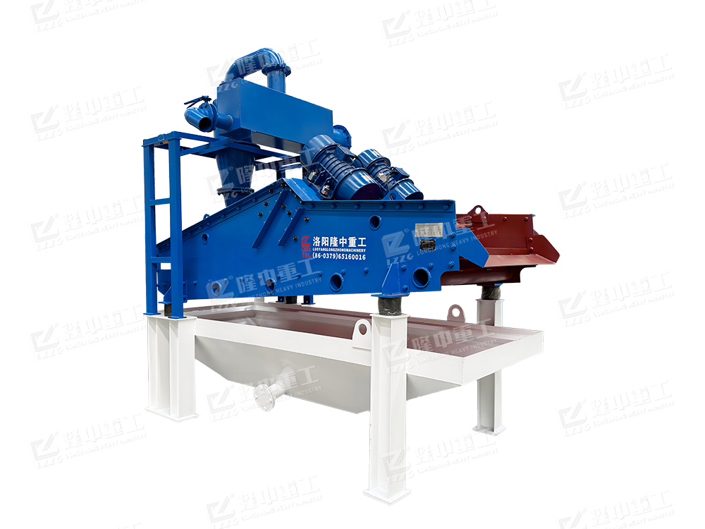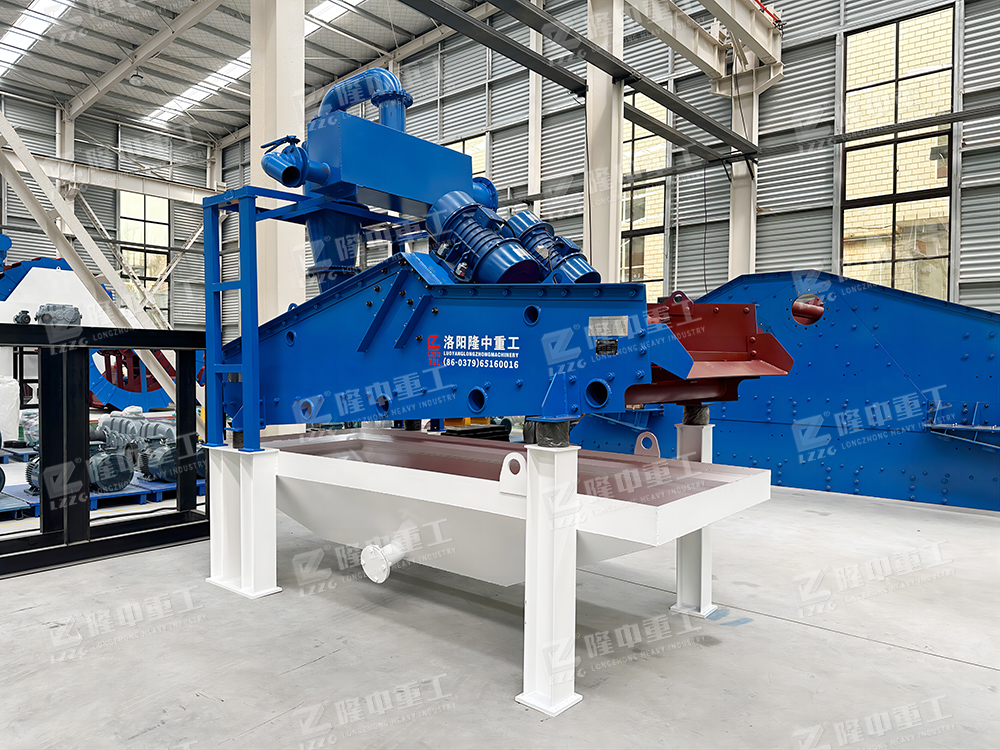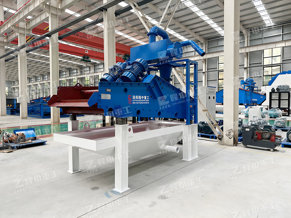2、工作流程:洗沙機撈出的粗砂直接進入脫水型細沙回收機的篩面,通過篩機和振動電機的帶動,并結合篩機設計的負傾角爬坡結構,物料在篩面上高頻振動形成濾層并脫水,從而實現粗砂脫水功能;而洗砂機溢流的洗砂廢水則進入到該設備清洗箱中,經由底部真空高壓泵抽至旋流器中進行分級濃縮,通過高速離心力和額定的入料壓力,旋流器將洗砂廢水中的細沙與水分離,而后將濃度被提升至60-70%的細沙通過沉沙嘴排入振動脫水篩表面,在高頻振動電機的帶動下,實現細沙的脫水回收,而其他的廢水、泥、粉等雜質則通過旋流器溢流口進入返水箱排出。