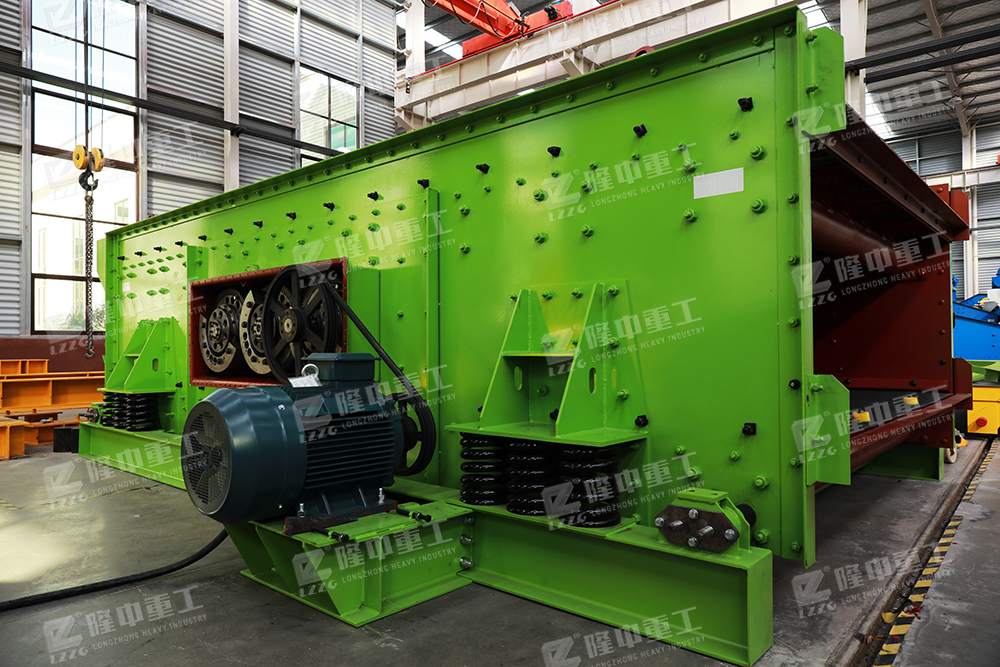 以三軸塊偏心激振器為激振源,以橡膠支承彈簧為彈性元件,以篩箱激振器等為可動部分的篩分設備。其振動器的三根軸上裝有相等偏心質量、相同偏心半徑的配重塊。動力由電機經皮帶傳遞至主動軸,再經速比為1的齒輪進行傳動,使三根軸同速旋轉,從而產生激振力,使篩箱作強制連續的橢圓運動。物料以此運動為動力,在水平的篩面上沿圓周方向作不斷的拋擲運動,在拋起松散分層的同時向前運動,周而復始地完成粒度分級和向前輸送的過程。